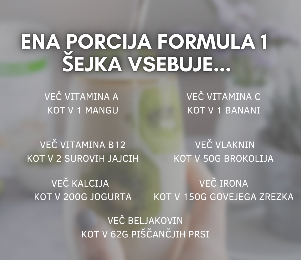Vsebuje 25 vitaminov in mineralov za podporo telesu, 5 g vlaknin za daljši občutek sitosti ter 8–18 g beljakovin.